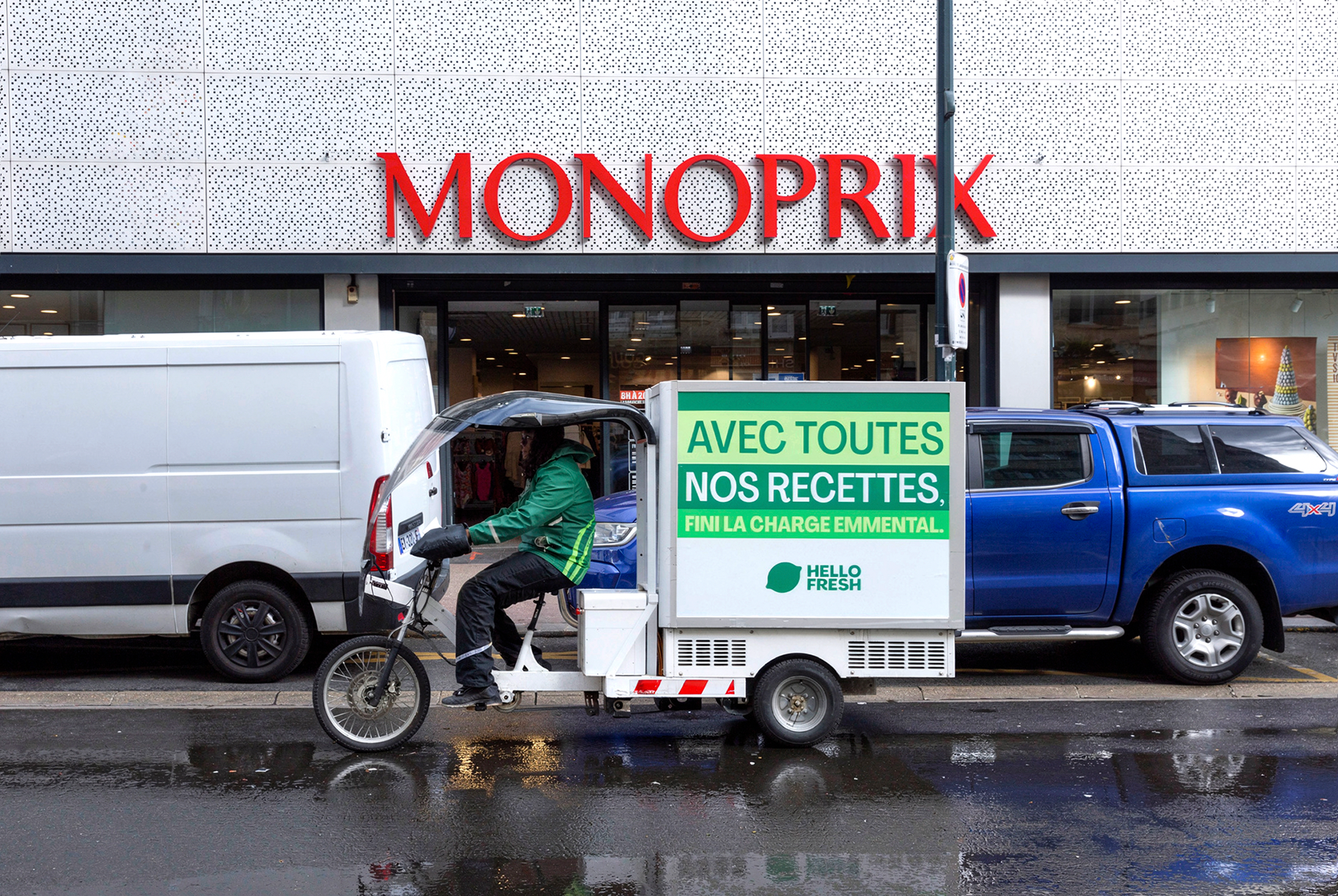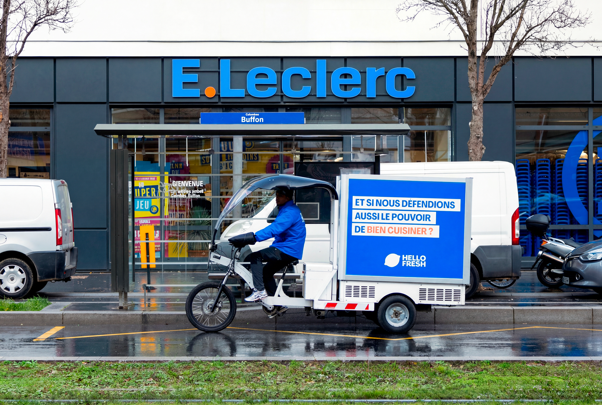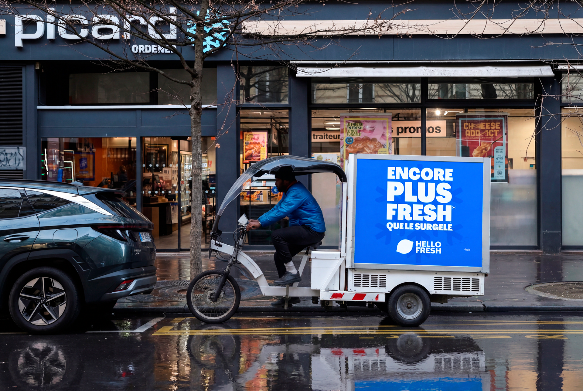 Leader des Box à cuisiner, HelloFresh rappelle qu’aujourd’hui, entre livraison, plats préparés et rythme effréné, le dîner perd sa valeur de moment de partage. Les solutions censées simplifier nos repas ont peu à peu effacé cette dimension essentielle. La marque détourne les codes visuels des acteurs qui dominent nos soirées : applications de livraison, supermarchés, fast-food, en infiltrant l’espace urbain. Vélos cargos et véhicules sont rebrandés avec des messages inspirés de ces enseignes, volontairement décalés. Supports publicitaires mobiles, ils deviennent un affichage tactique sans achat média, pour valoriser notre promesse : retrouver la fierté du fait maison. Pour amplifier l’idée, nous interpellons directement les passants avec des sacs de course reprenant nos messages détournés.